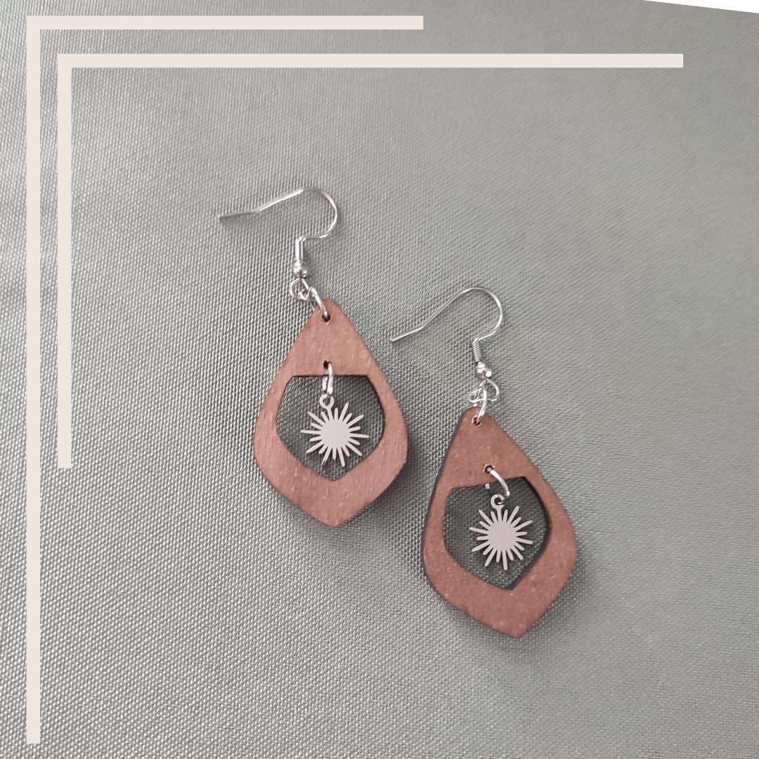 Laissez-vous séduire par l'esthétique poétique de ces boucles d’oreilles. Conçues sur une base en bois de peuplier en forme de goutte délicatement ajourée, elles révèlent en leur cœur un soleil rayonnant en acier inoxydable argenté. Un bijou qui joue sur la lumière et la transparence pour illuminer votre port de tête.